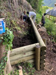 5月7日、雨上がりの朝 北斜面の我が敷地の一番上、つまり南側、鹿猪除けフェンスに沿った、この部分に畑を作る日です。 9時半、土留めにする材木を積んだトラックと、造園屋さんのスタッフが到着。 場所の確認と、丸太の内側にプラ […]