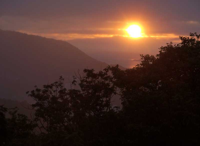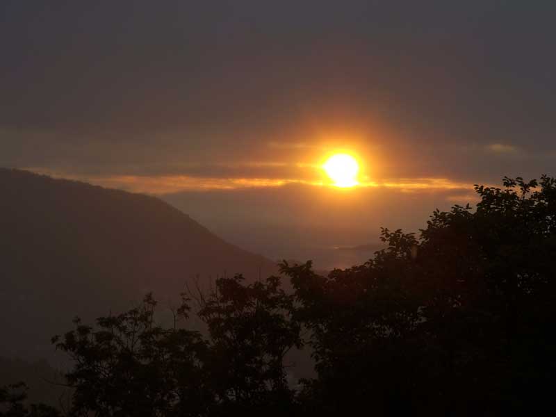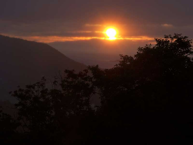 ここに家を建てた頃は海がもっと見えていたのですが、手前の木々が大きくなって、海がほとんど見えなくなりました。梅雨なので湿気をおびて霞んだ空気の向こうに、柔らかな輝きで昇る朝日・・・ 元気を出さなくては!静かなエネルギーをもらいました。