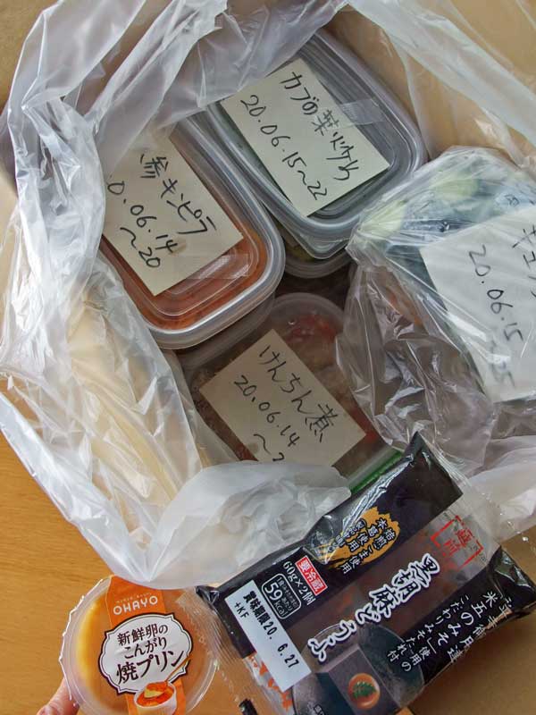 この日送ったのは、ケンチン煮、人参のキンピラ、ブロッコリーの塩茹で、カブの葉の塩炒り、胡瓜の麹漬け、胡麻豆腐2種類、カスタード・プリン、干し芋。Mさんの好物の焼き野菜用と卵たっぷりのポテトサラダは作れませんでした。