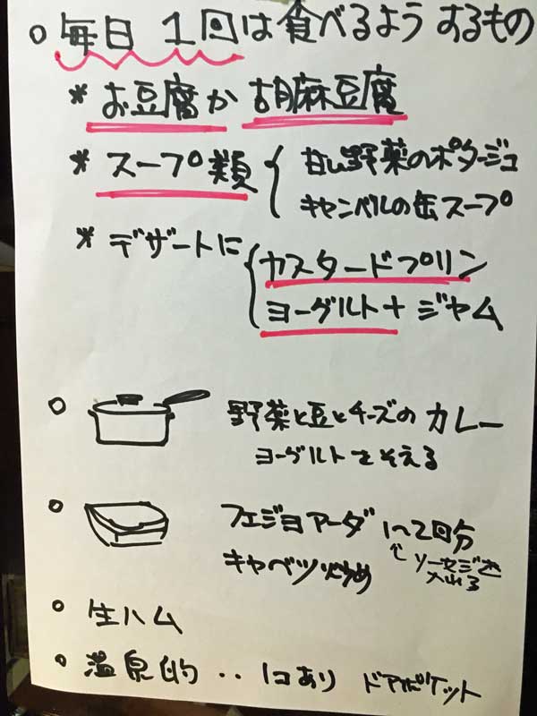 Mさんは今グラグラになった歯を針金で縫うように止めて固定しているので、前歯が使えません。それで作り置き料理もご覧のように、あまり噛まなくてよいものです。ぐらついた骨が固まるまで3か月、蛋白質をしっかり食べる事が大切と歯医者さんが話されました。