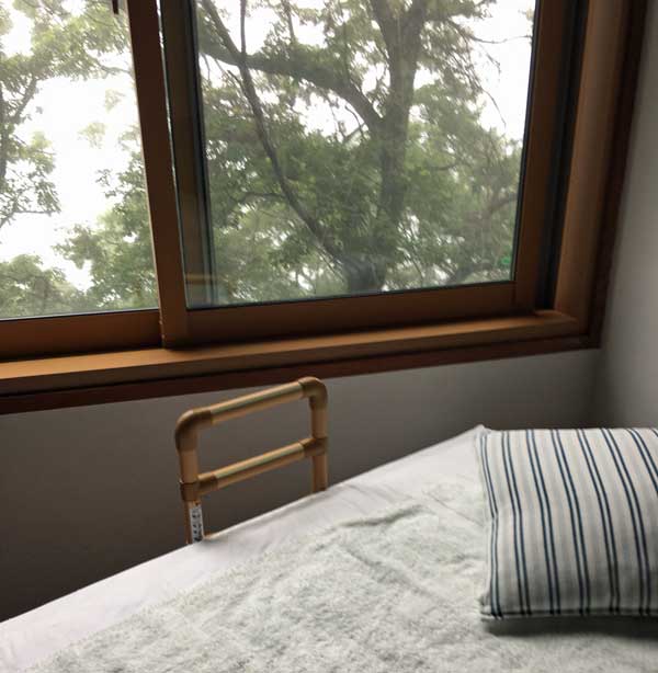 ベッドでの寝起きも大変だったので、このような床置き型の手すりも設置して下さいました。