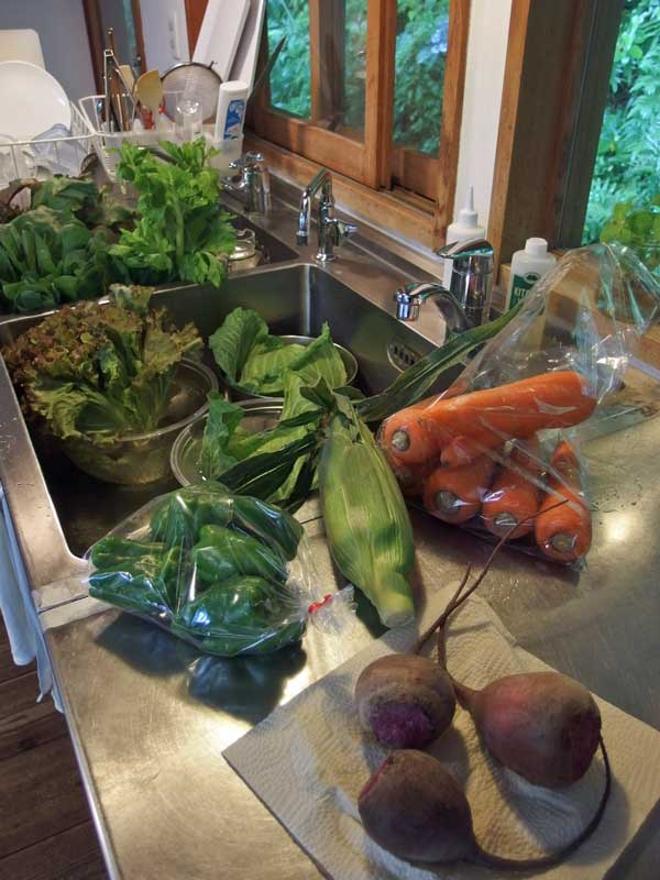 電話するとその日に野菜を届けて下さいました。私がお願いした野菜プラス、近隣で野菜作りを頑張っている農家さんの珍しい野菜を篭盛りにして、玄関まで持って来て見せて下さいました。全部欲しいくらいでしたが骨折していて料理もままならないので、グッとこらえて葉っぱの着いたビーツ、リーフレタス、採れたてのトウモロコシを選びました。八百屋さんは私が野菜を運ぶのが大変なのを察して、野菜を台所のテーブルまで運んで下さいました。