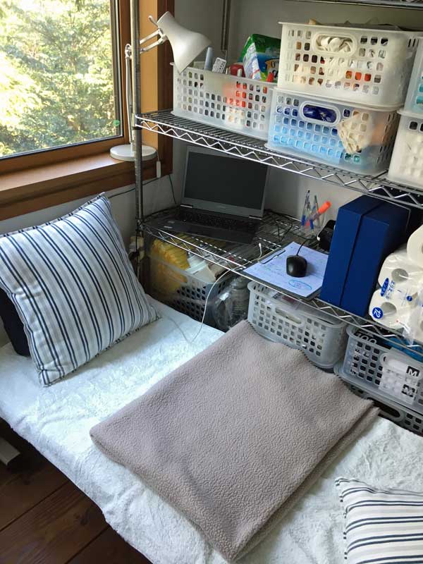 この春、腎臓を悪くして寝たり起きたりしていた時、私はKさんの助言を思い出し、この家で唯一天井や戸があって小さいこの部屋にエアコンを取り付け、具合が悪くなったらそこで横になれるよう簡易折りたたみベッドも買ってあったのです。