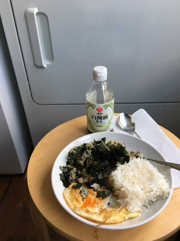 今日のお昼はこの一皿。卵の揚げ焼き、冷凍してあったモロヘイヤに白胡麻ともみ海苔、それにバスマティライスと5分づき米が半々のご飯です。このお皿を台所から、やっとこさっとこ・・・家で一番涼しい場所に運びました。