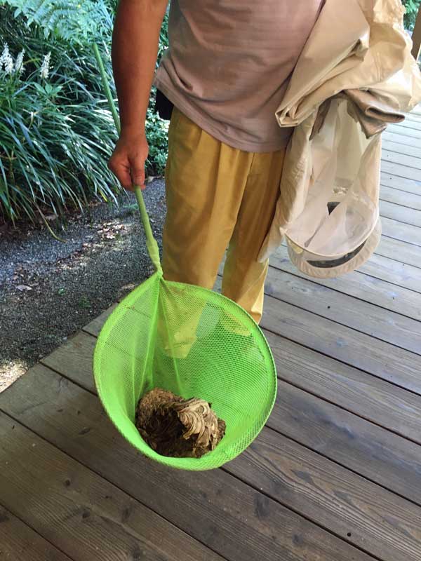 早速管理事務所に電話して見てもらうと、洗濯室の真上にあたるテラスの床下にバレーボール大のスズメバチの巣がありました。日を改めて完全防備に命綱で駆除が始まりました。