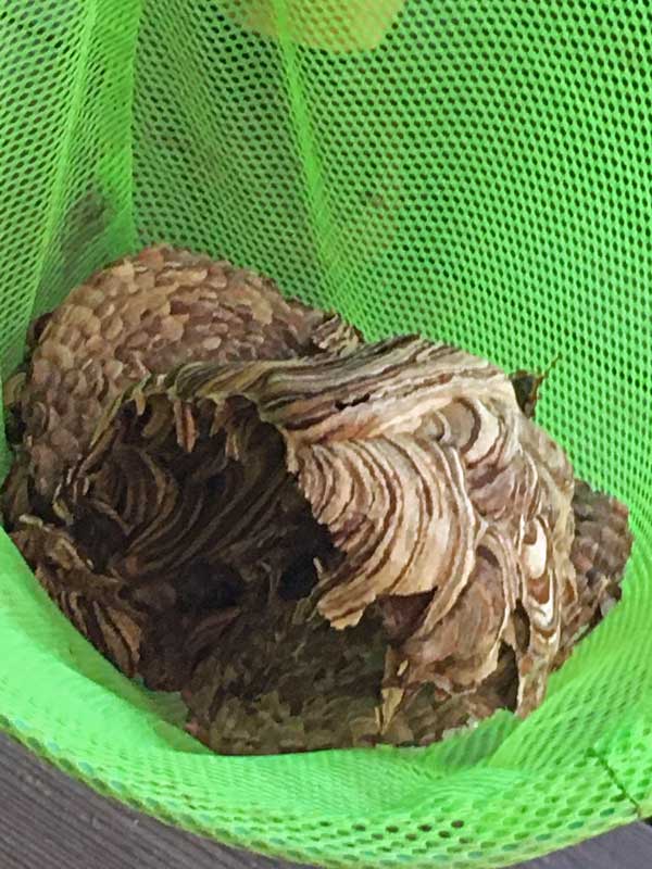 シュ~ッと薬を散布する音、何匹かのハチがものすごい勢いで逃げ出して飛んで行き、薬にやられた蜂は垂直に下に落ちて行きました。ゴソゴソ多分巣を取り外す音がして「終わりました~」の声