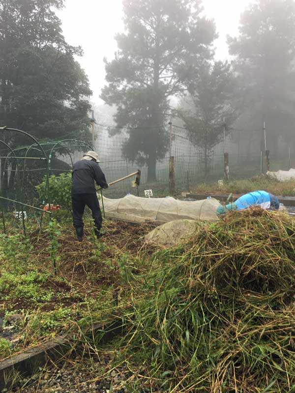 この雑草を引き抜き、抜けない根は掘り返し、抜いた雑草は一旦共同の通路に積んで、最後に畑一面に積んで畑の肥料にする事に決めました。作業開始です!