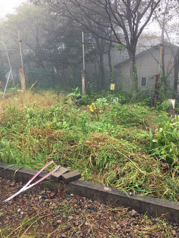 早速、全員作業着に着替え、Kさんの車に草刈りの道具を積んで、濃霧の中貸農園へ向かいました。3ヶ月以上ぶりの畑はルバーブと青シソ以外は全滅、雑草が身の丈に全体を覆っていました。