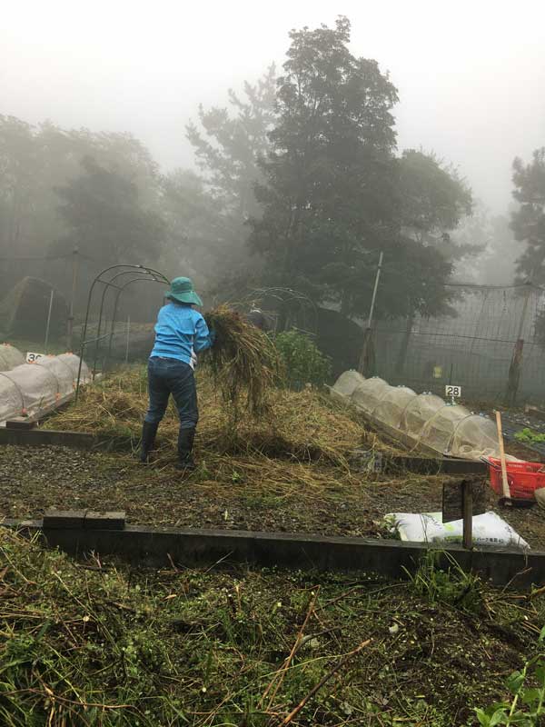 通路に山と積んだ雑草を、最後に綺麗になった畑に平均にまいて作業終了。1時間半でこの大仕事を終える事が出来ました。