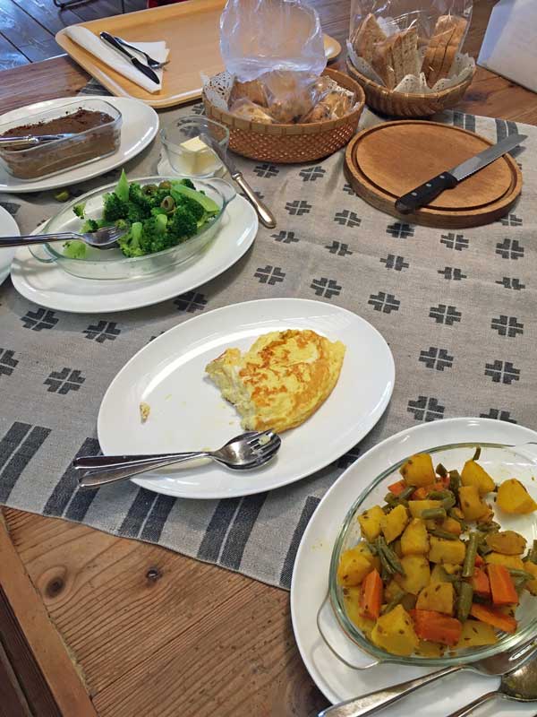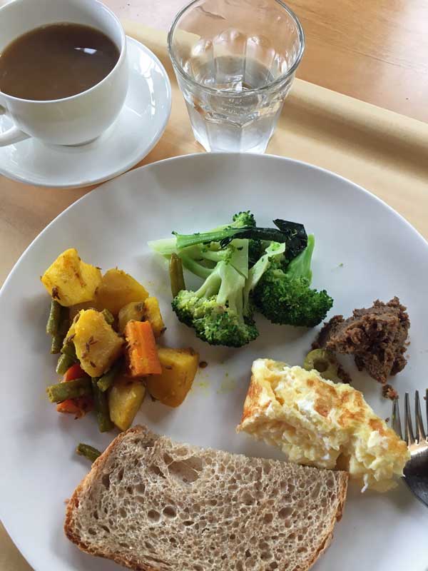 <メニュー>レンズ豆のパテ、ブロッコリーのマリネサラダ、オムレツ、野菜のインド風蒸し煮。パン類はグラハムブレッド、スコーン2種類、バナナマフィン。それにコーヒーです。
