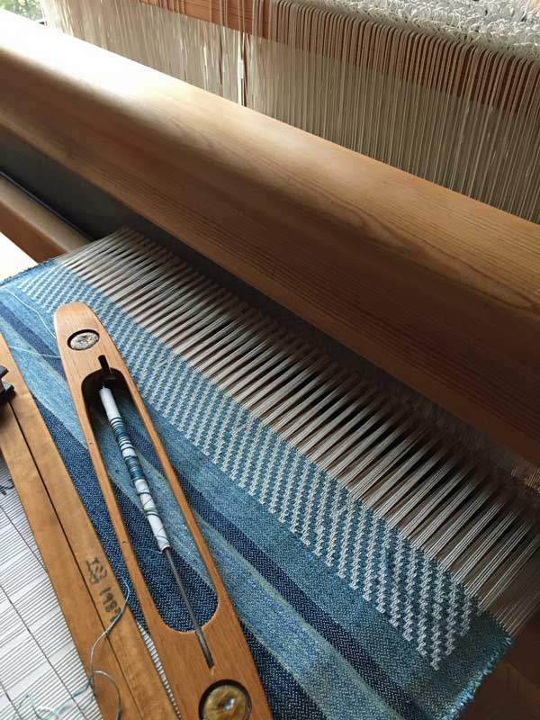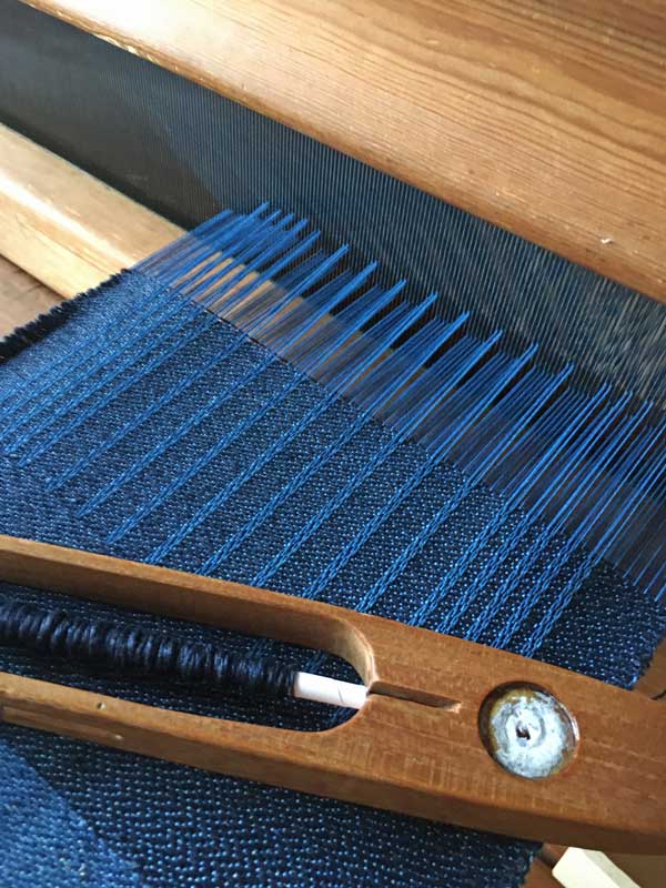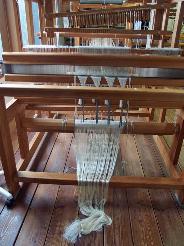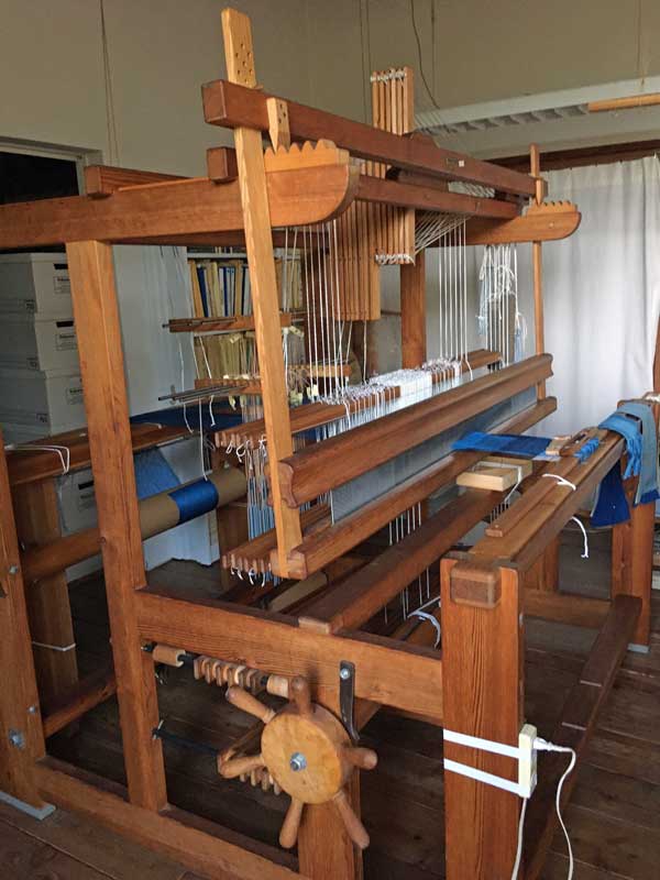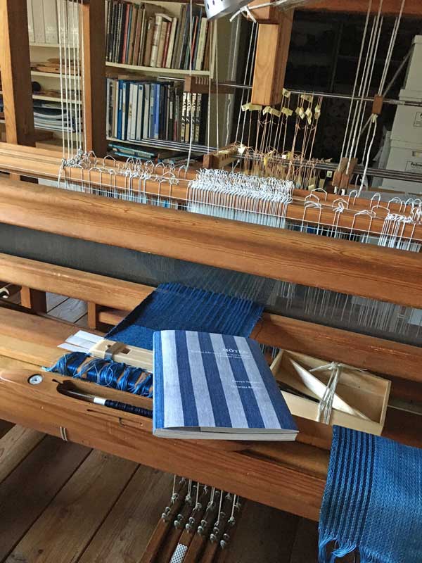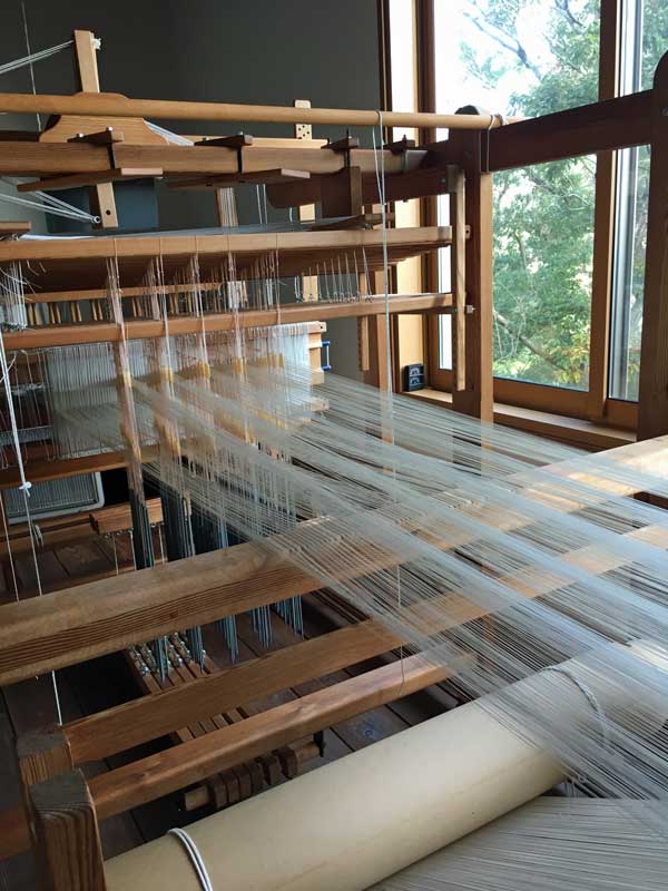 この織機は、恩師が教えていた学校で開発されたもので、身体に易しく設計されていて”手織り機のロールスロイス”とも言われています。私は昔別の織機を3台使っていたのですが、織り続けるうちに身体に負担が来て手首や膝を痛めてしまったので、このスエーデンの織機に全部取り換えたのです。