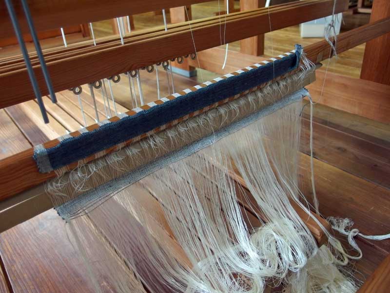 この織機はダマスク(緞子)を織るようにセットアップされているので、模様織のために経糸を途中で引っ張て上下させます。そうすると経糸にテンションがかかり、弱っていた経糸が切れるのです。それを1本1本取り替えたり繋いで・・・