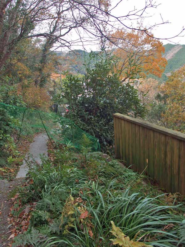 落葉が進み、玄関前から入り口の方を見ると、その向こうに山が見えるようになりました。