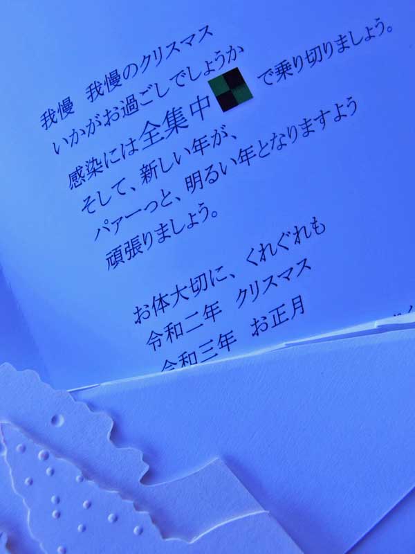 彼は日本とマレーシアに家があって、お嬢さん家族はマレーシア。コロナが流行りだした時はマレーシアで、厳しい状況の中日本に帰国されました。以前のカードにあった可愛いお孫さんの写真、そのお孫さんにも会えない、我慢、我慢のクリスマスなのです。