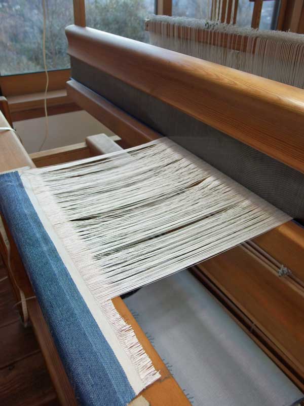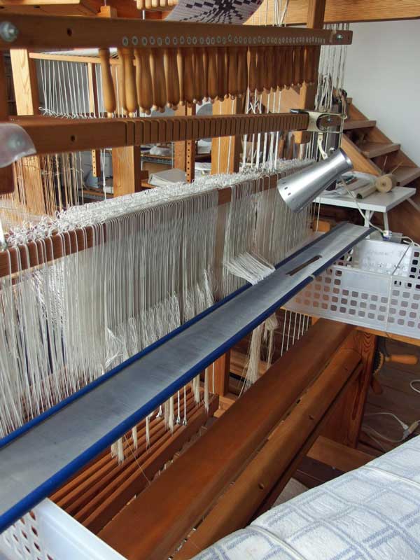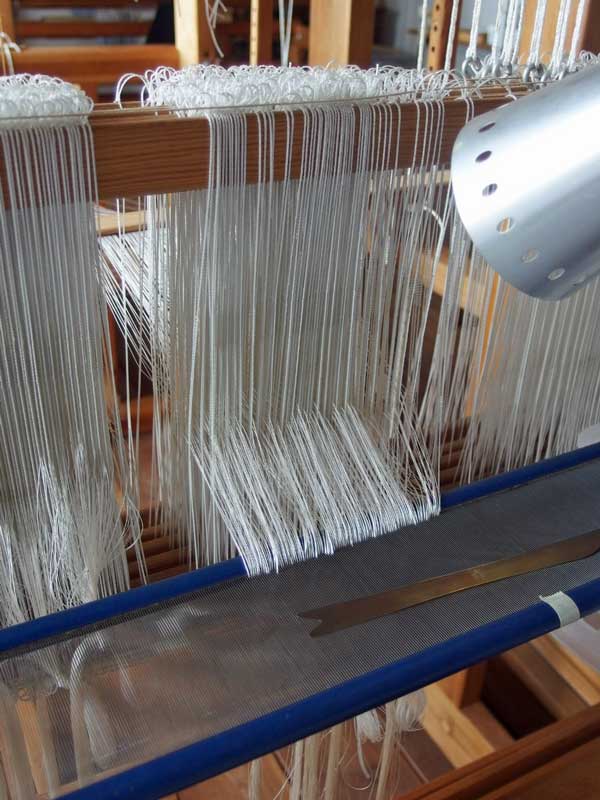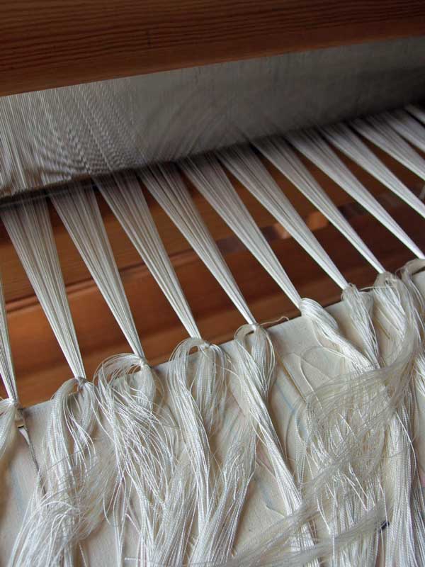 この織機はスエーデン製なので、スエーデン式に結びました。そして織り始めたのですが・・・ 経糸が絹で滑りやすいからか直ぐに緩んで来るのです。北欧の織機はウールや麻を織る事が多くその仕様だからだと思います。