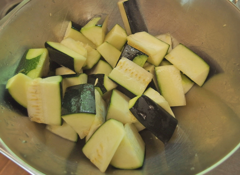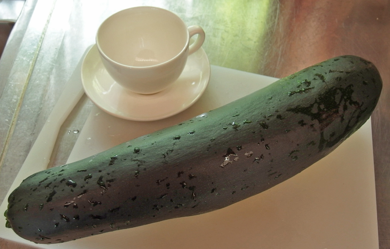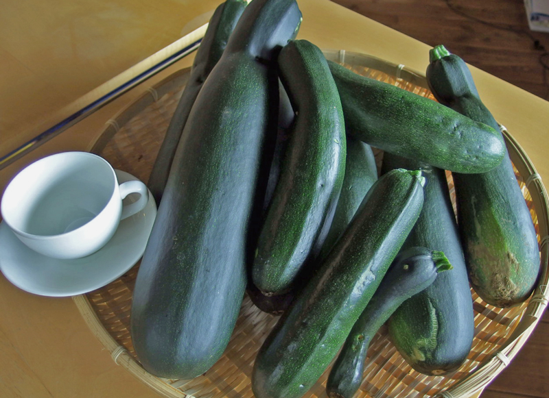 胡瓜のように一晩で大きくなる野菜は、マクロビオティックでは陰性が強いと習いましたが、ズッキーニも同類のようです。 Mさんはズッキーニは雨でも見回りにゆかないと駄目みたいだ、なんて言っています。 少しでも小さいのをご近所に配って、一番大きいのを先ず食べることにしました。