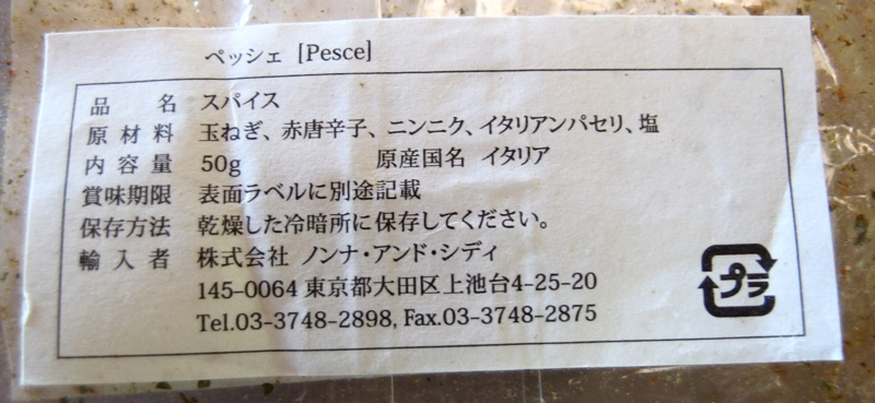 同じメーカーのもう一つのハーブミックス ペッシェ は赤唐辛子が少なくて、玉ねぎの味が勝っているので、この方が使いやすいかもしれません。