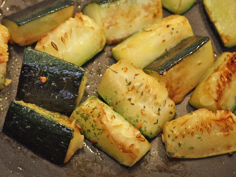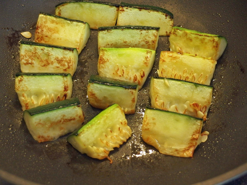 フライパンにオイルを少量入れて、ズッキーニの各面をしっかり焼きます。