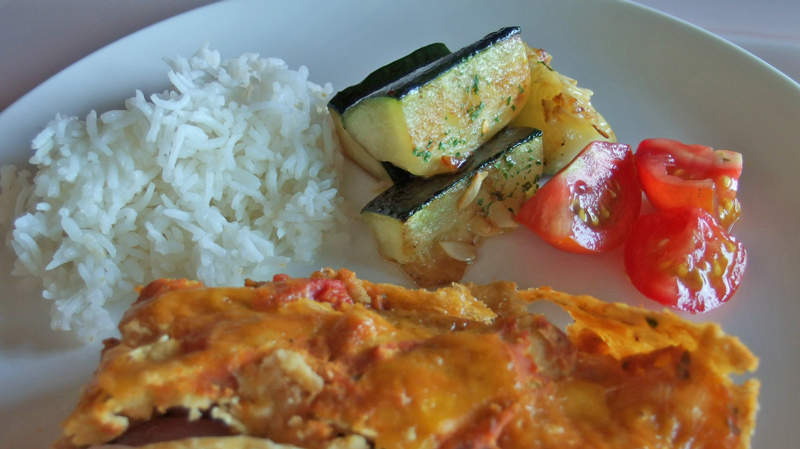 遅めのブランチに付け合わせました。 この写真は最初にサーブしたズッキーニで、このあと何度もおかわりして、あの大きなズッキーニの三分の一が二人のお腹の中に消えました。