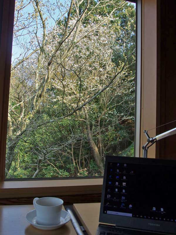 コロナ禍になってから窓辺に移動したテーブル、その窓の向こうにも桜の木が1本。