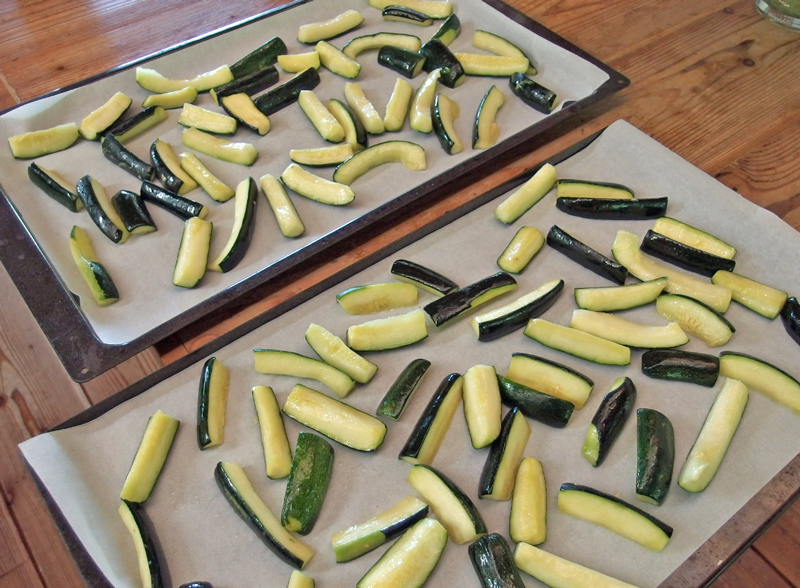 天板にオーブンペーパーを敷いた上に、ズッキーニを並べて、230度のオーブンで焦げ目がつくくらいに、15分前後焼きます。