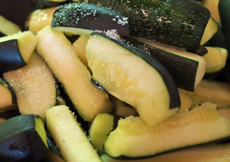ズッキーニがオイルでコーティングされました。 こうする事で焼く時表面温度が高くなり(水は100度だけれど、油は200度以上になるので)、表面に焦げ色がつきやすくなります。