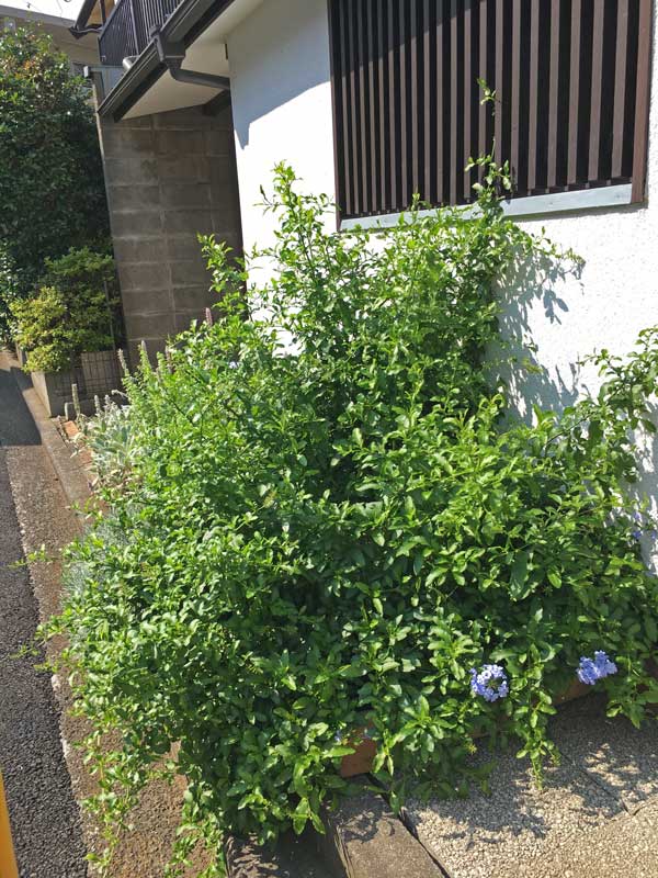 この土日に、1か月ぶりに横浜の家へ行って来ました。4月末に10か月ぶりに横浜へ行った日は雨でしたが、今回は素晴らしいお天気!玄関前に一昨年植えたルリマツリの小さな苗、それがこんなに茂って紫色の花が咲き始めていました。