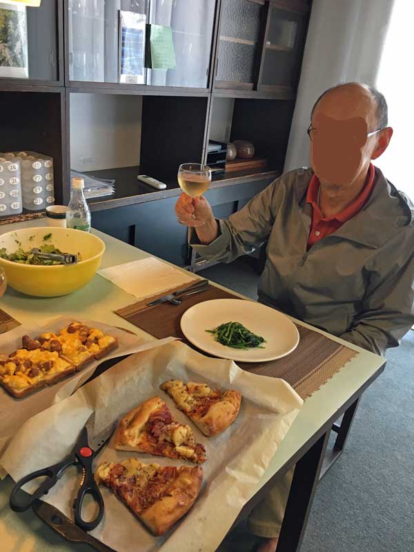 翌朝は少し疲れ気味な感じでしたが、お昼はこの通り。メニューは、ヘルパーさんが買って冷凍してあったピザ、作ってあったチーズとソーセージ入りスクランブルエッグをのせたトースト、ホウレン草ソテー、サラダ菜とブロッコリーのサラダ。それにMさんが自分で冷蔵庫から出して来たジンジャーエールです。