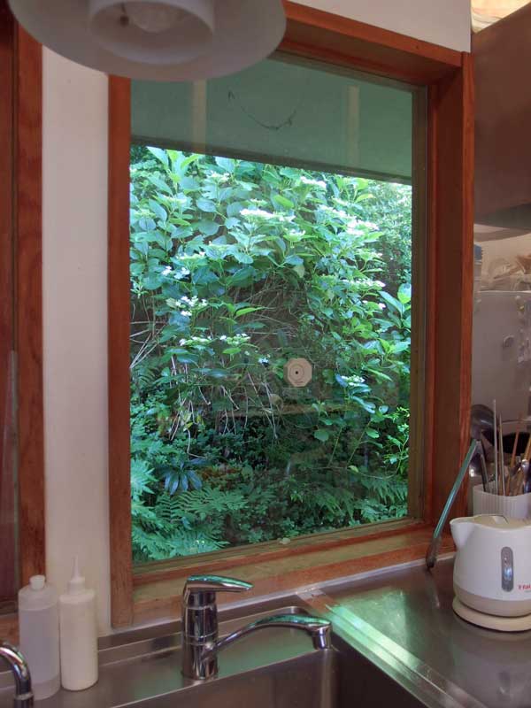 台所の窓の向こうの紫陽花、