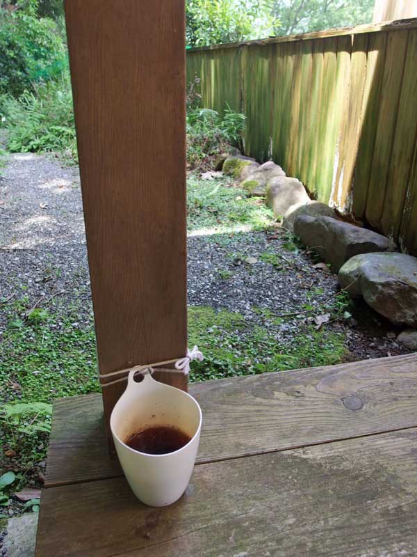 虫はムカデだけではありません。毛虫、蜘蛛、蚊、蚋、虻、蛾、蜂、蟻・・・ 虫よけとして家の外回りには”木酢液”を入れた容器をあちこちに置いています。