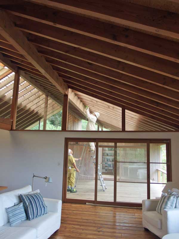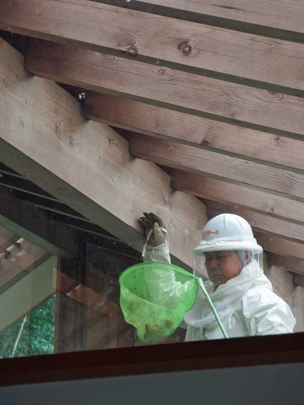 無事、巣が撤去されました。 でも蜂は外出中で留守だったらしく、「戻って来てまた巣作りを始めないように、梁に殺虫剤を噴霧して置きました」との事。