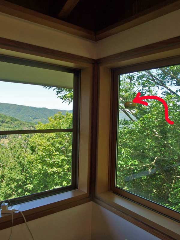 その後、私が東のコーナーの窓辺にいる時、何かが窓のガラスにぶつかる音が時々するのに気付きました。それがスズメバチだったのです。一度は窓を開けてカメラで外の景色を撮っていたら、スズメバチが家の中に入ってしまいました。大急ぎで虫よけ瞬間冷却スプレーを使って外に追い出したのですが、何処か近くで巣作りをしているらしいのです。