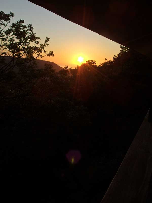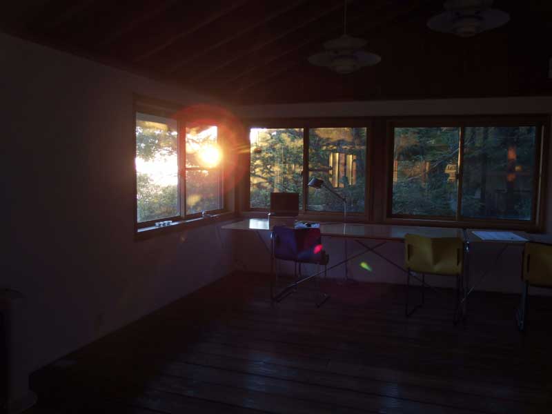 リビングに日の出の光が差し込んで、家の中が赤く燃えるよう