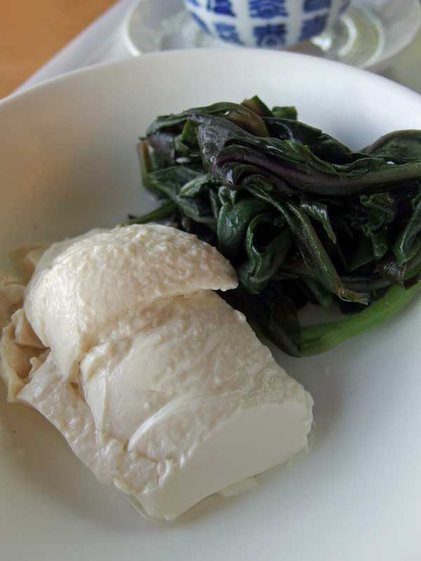 冷や奴に金時草(水前寺菜)の塩茹で添え。