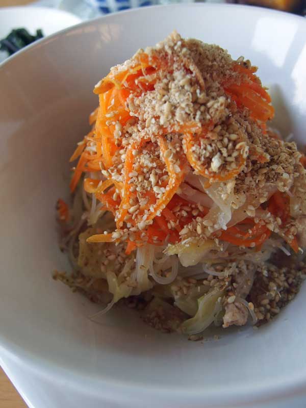 この時は、冷蔵保存してあった炒めビーフン(新竹ビーフン・干し椎茸・大豆ミート・玉ねぎ・キャベツ・もやし)をレンジで温め、上に人参の塩炒りと白胡麻をのせました。
