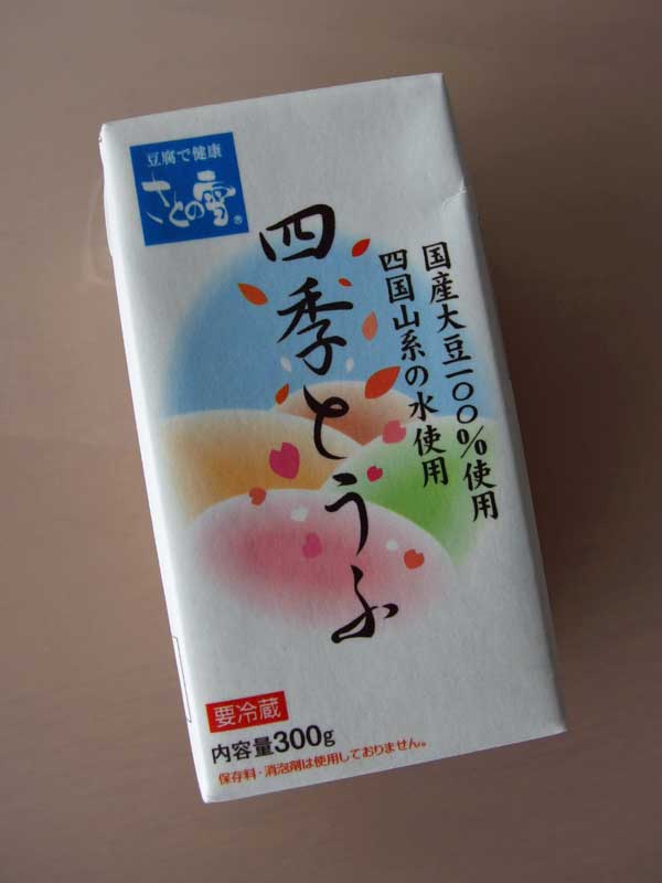 お豆腐は冷蔵で240日間保存できる紙パックの「四季とうふ」です。徳島県のさとの雪というメーカーが作っていて、原材料は国産大豆と塩化マグネシウム(にがり)、保存料は不使用。大豆の味がする美味しいお豆腐です。、