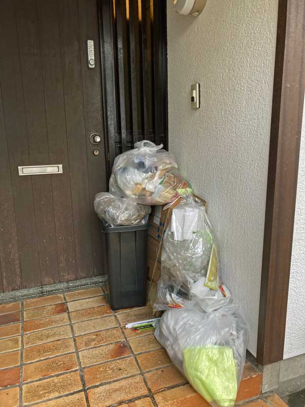 この時は「ふれあい収集」の日でなかったので、こんな風に燃えるゴミの袋を玄関に山積みして、私は伊豆へ帰り、翌日午前中のヘルパーさん到着時間に電話。ゴミ収集が未だ来ていないか確かめて頂いてから出してもらいました。横浜の家の庭の前がゴミ収集場所で本当に有難いです。
