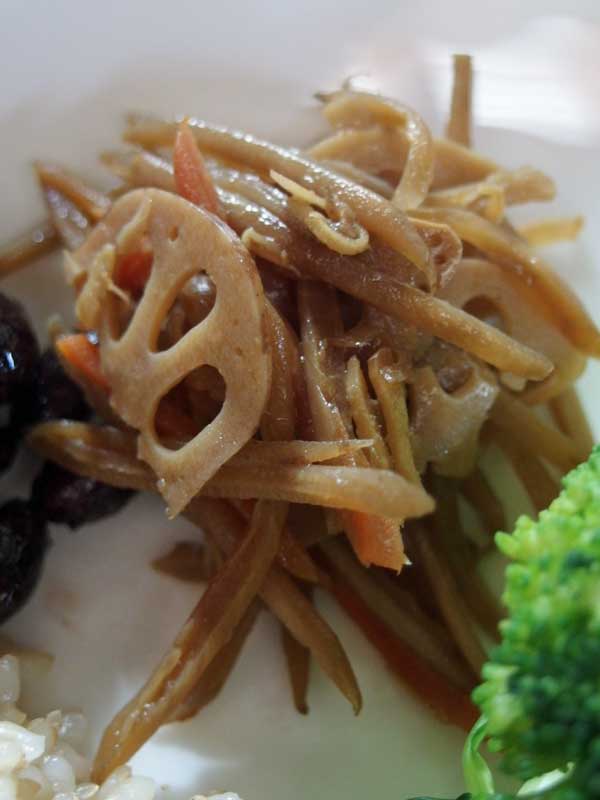 牛蒡、人参、蓮根のキンピラ。この3種類の根菜が入る事で、牛蒡と人参のキンピラより陽性度が上がるという陰陽の世界の不思議。根菜類は人間の身体の基礎固め「地に足が着く」のようです。