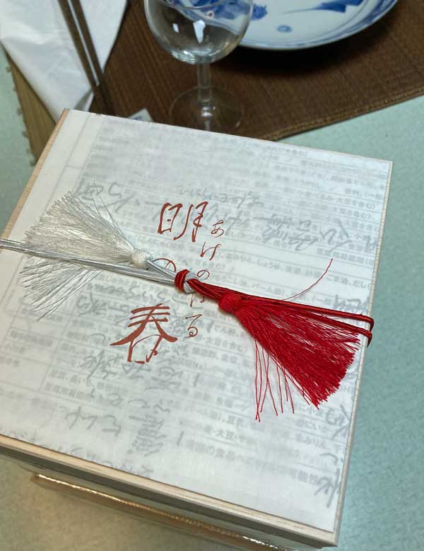 風呂敷包みは10月に12月29日着で注文していた冷凍のお節です。無事ヘルパーさんに受け取って頂き、冷凍庫に保存出来ました。このお節は昨年も購入し、Mさんから美味しかったと聞いたので2度目です。でも昨年私は骨折で横浜へ行けなかったので、見るのも食べるのも初めて。食べる1日前に冷蔵庫へ移し、その後2~3時間前に室温に置いて食卓へです。