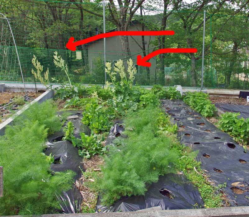 前回行った20日前は、丈が20センチ程だったルバーブに、花穂が立ってこんなに大きくなっています。