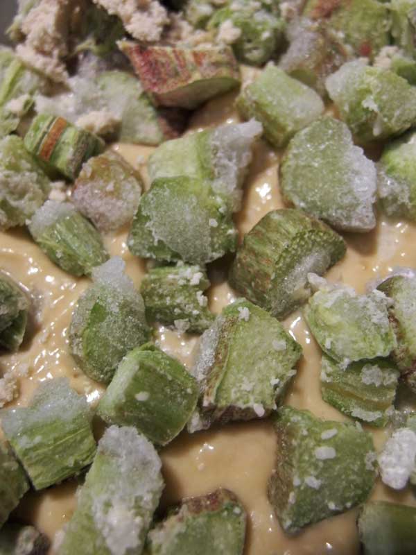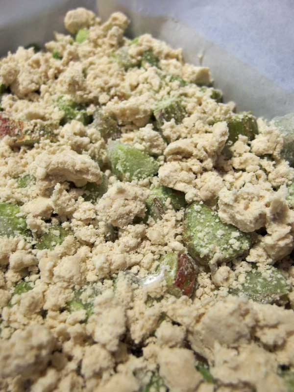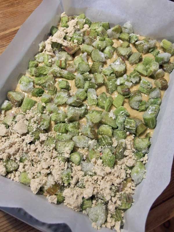 薄力粉、ヒヨコ豆粉、オイル、豆乳、キビ砂糖のケーキのタネの上に、凍ったままのルバーブを広げ、その上に薄力粉、キビ砂糖、ココナッツオイルのクランブルを散らします。