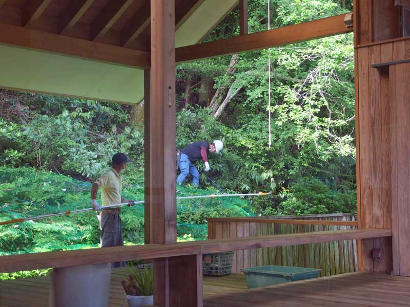 伊豆の山に仕事場を建てたのは26年以上前、その時は大きな木は無かったのですが、高温多雨のこの地の木はあっという間に大きくなります。今まで何年か毎に伐採して来たのですが、ここ数年Mさんの病気と介護、私の骨折と病気に気を取られているうちに木々はグングン大きくなり、家を覆うようになってしまいました。
