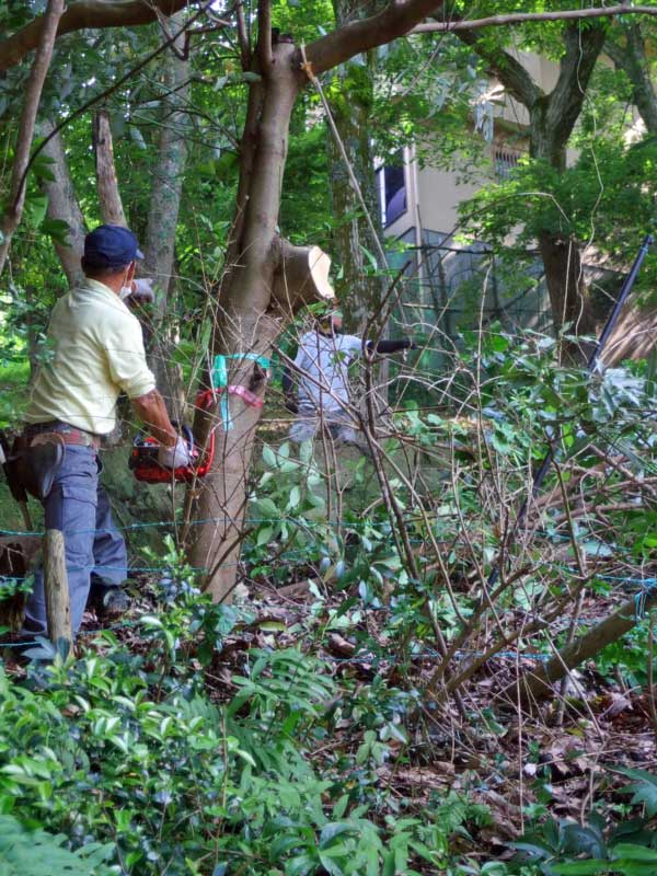 若い職人さん方は、親方の指示通りに動きます。幹から伸びる枝にロープをつけて、切っても下に落ちないようにして枝を切り、最後に幹を決められた方向に倒れるよう切り倒します。4人で午前中いっぱいかかりました。