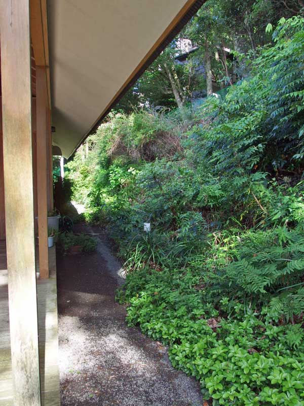 入り口から玄関への小道。私が骨折した時玄関まで車椅子が通れるように、ボランティアの方が草刈りをして下さってから通り易くなったのですが・・・ 木が覆いかぶさるように大きくなって、上から虫が落ちてくるので帽子なしでは安心して歩けない状態。