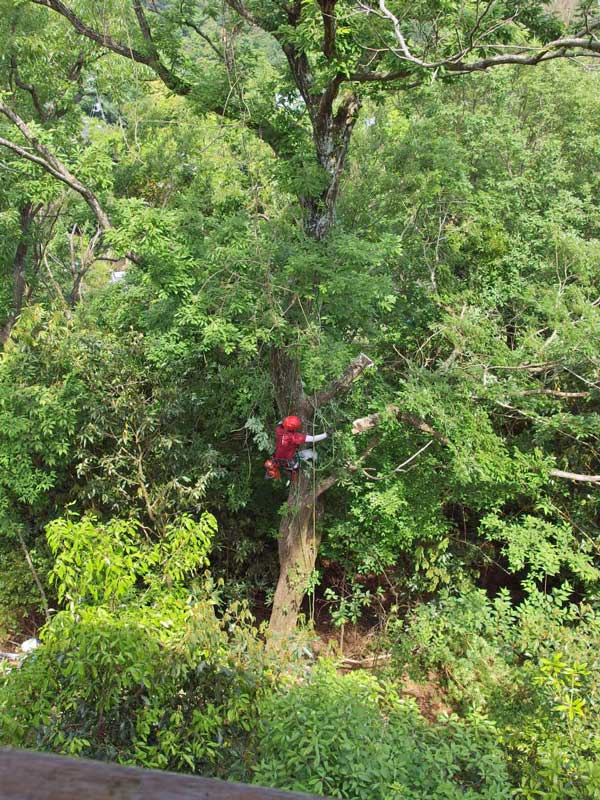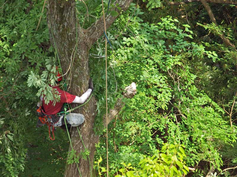必要な道具は全て腰回りに着装し、身体はロープで木の幹にブランコのようにして括って、宙ぶらりんの状態での作業です。