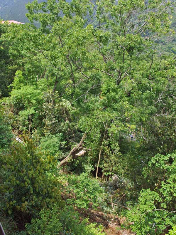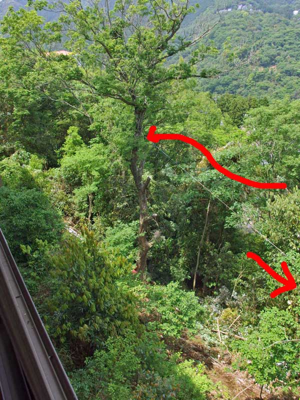 木の倒れる周辺にある小さな木を、下にいる職人さんが次々切り倒して木が横たわるスペースを作ります。立っているのも大変な急斜面を親方の指示で職人さん達はあっちへ行ったりこっちへ行ったり・・・ 大変な作業です。