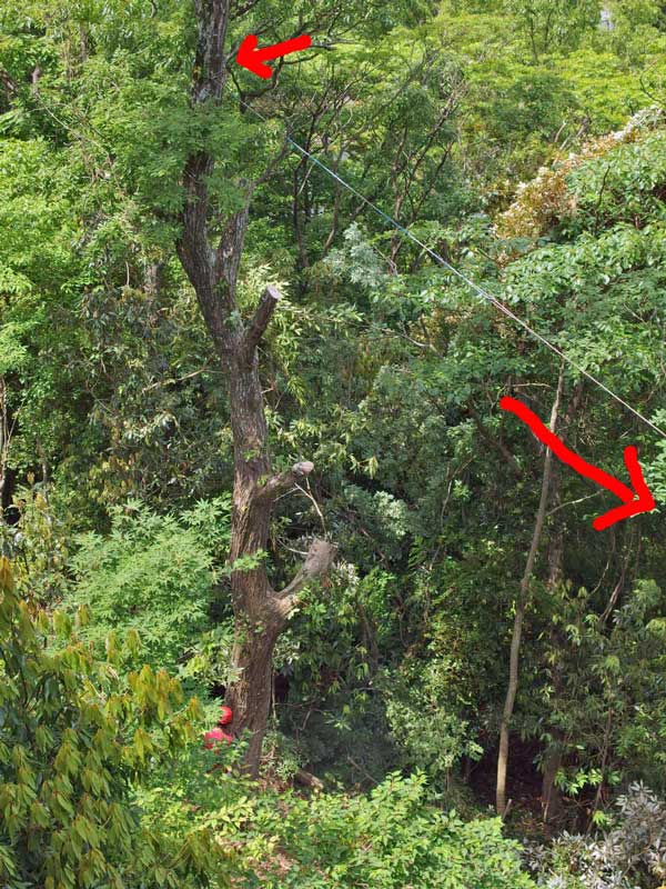 次に幹にワイヤーロープを回して、赤シャツさんは木から下りました。