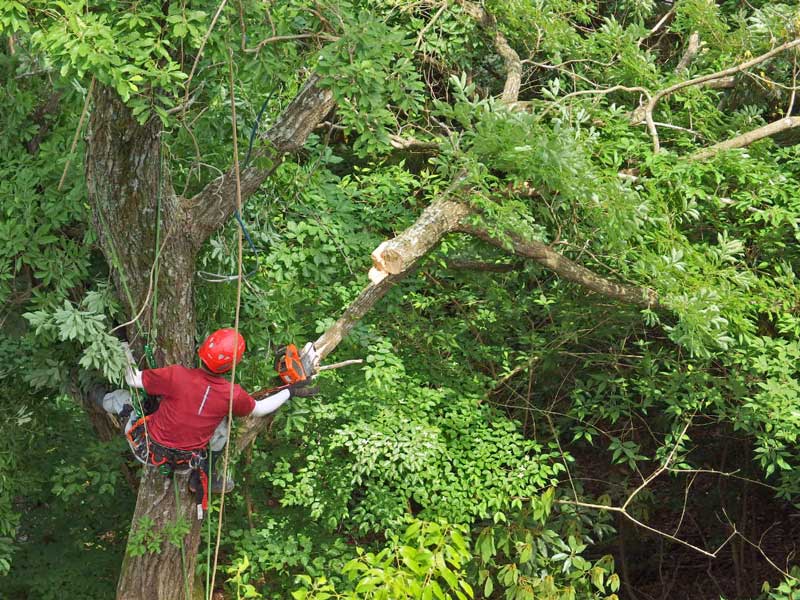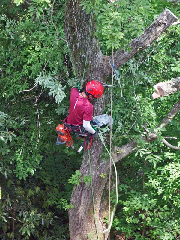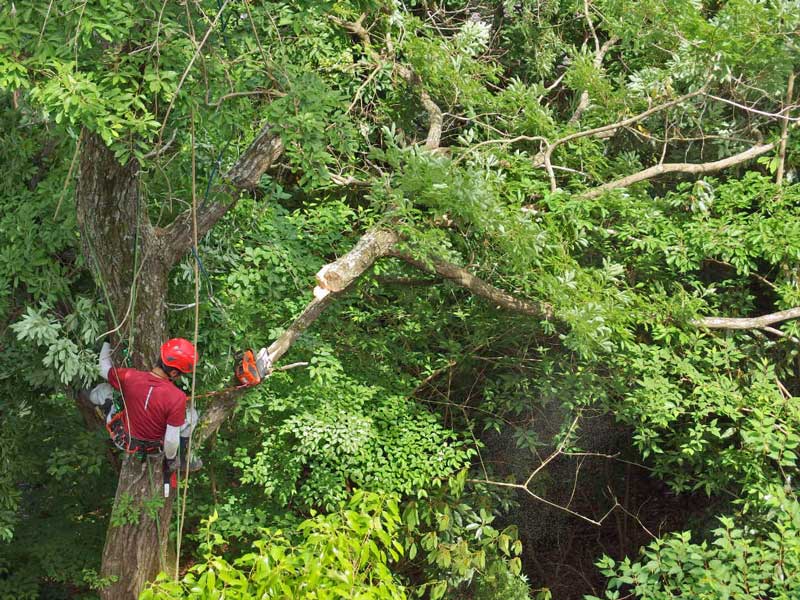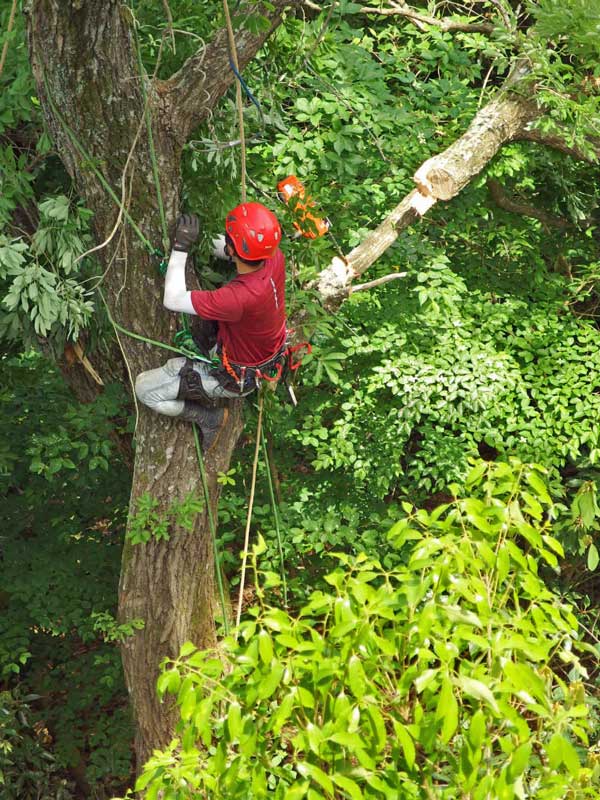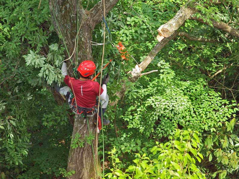 木が倒れた時、幹がちゃんと地面に横たわれるよう邪魔になる枝を切り落として行きます。