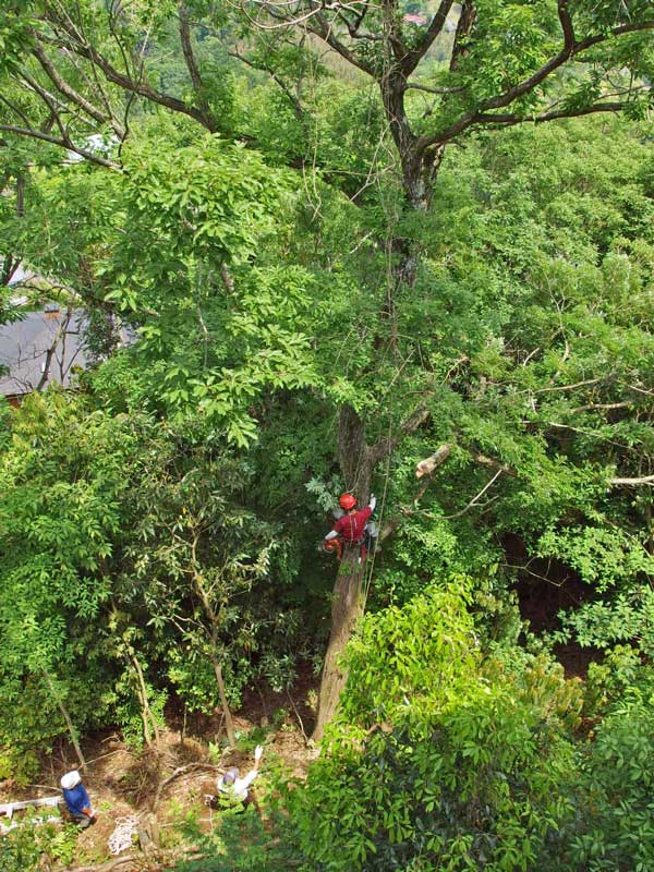 木の下では親方が色々指示し、他の職人さんは木の上の赤シャツさんが仕事しやすいよう、下で動きます。