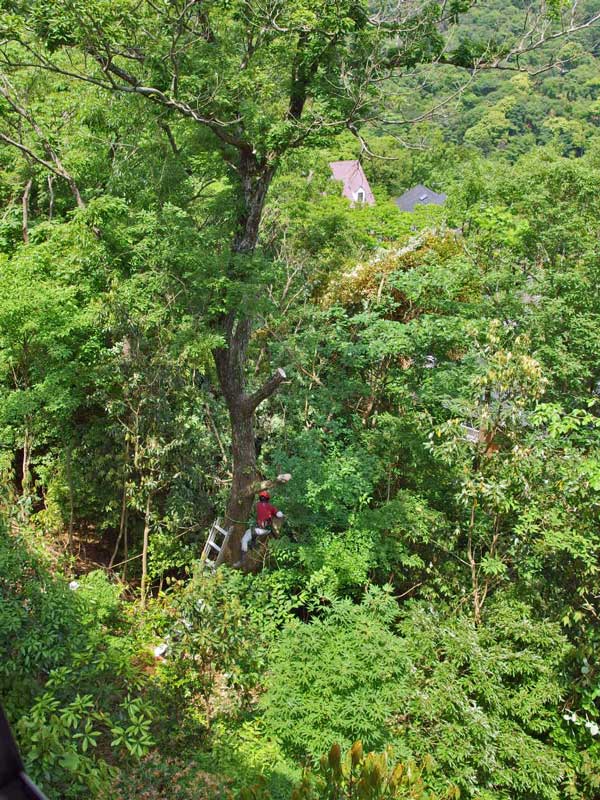 立っているのも大変な急勾配での大木の伐採作業は命がけです。最初の2本の伐採の時は、私は家の中で”木への感謝と職人さんの安全”を祈っていました。後半伐採の大きな木は家の下にあったので、家の2階から伐採作業がよく見えました。それで写真を撮って記録しようと思いました。